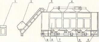 1、电控箱 2、升运装置 3、输送带装置 4、上风道及排湿系统 5、振动筛 6、蒸汽管路系统 7、送风系统 8、干燥室 9、底架 |