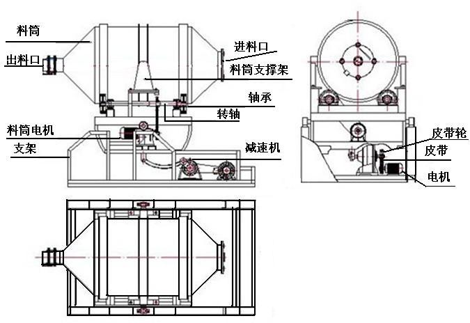 二维混料机主要由转筒、摆动架、机架三大部分构成。转筒装在摆动架上,由四个滚轮支撑并由两个挡轮对其进行轴向定位。在四个支撑滚轮中,其中两个传动轮由转动动力系统拖动使转筒产生转动,摆动架由一组曲柄摆杆机构来驱动,曲柄摆杆机构装在机架上,摆动架由轴承组件支撑在机架上。特点